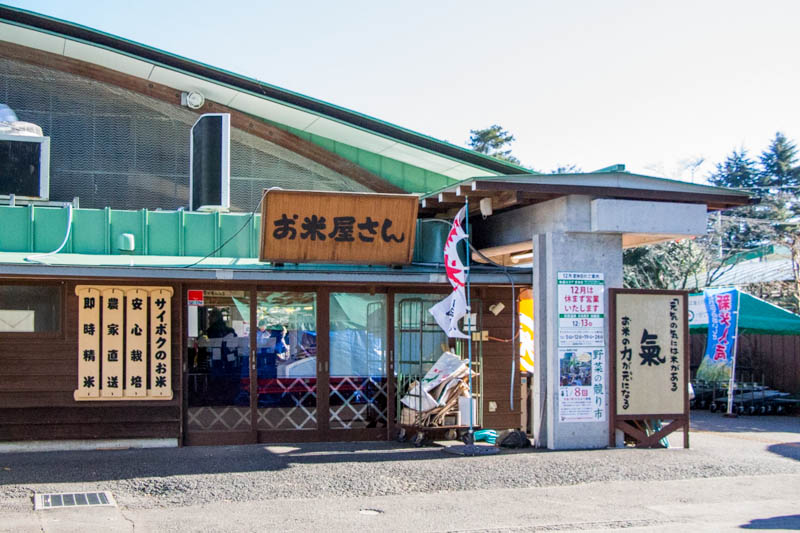 野菜売り場の隣には果物屋さんやお茶屋さん、お米屋さんもあります。なんでも揃う!
