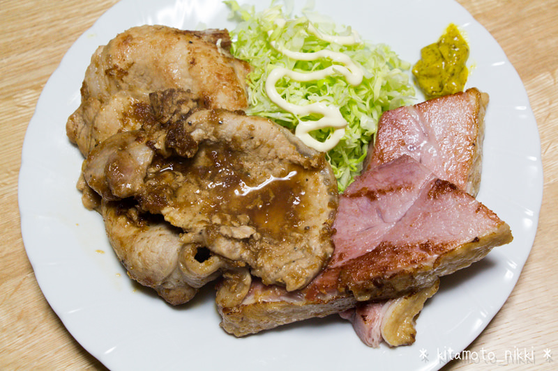 ▼生姜焼きとハムステーキのコンビ、なんてのも良いぞ。
